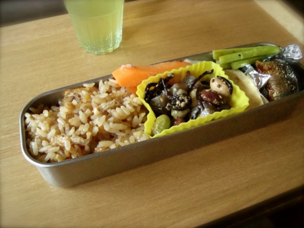 この、大変茶色い炊き込みご飯ですが、見た目ほどしょっぱくはありません。生姜とゆずが入っていて、さっぱりしています。今週はこれでおっしまい。