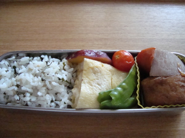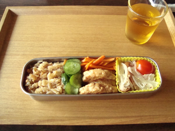 それはさておきこのプチトマトはマリネなので、皮をむいてあるのです。これを夫の弁当にはぐいぐいと二つほど詰めました。爆発したらどうしよう! と思いつつ。どうですかね。