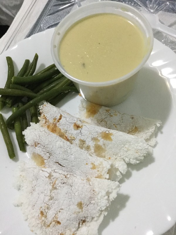 ブラジル製のインスタント焼きそば、茹でインゲン、タピオカクレープ(トマトソース&チーズ)。