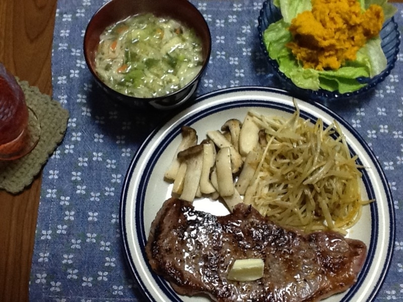 白菜、モヤシ、しめじに豚肉を乗せて深めフライパンてんこ盛りでタジンふうに蒸し煮にして食べた。