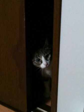 さすがにそれが分かった猫は、体操服姿の家族が現れると血相を変えて逃げ出します。