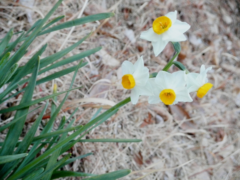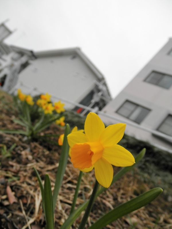 小学校の通学路にいつの間にやらスイセンが。秋に植えてたのかしら?去年はなかったと思うんだけど。