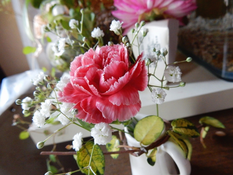 メダカのためにホテイアオイを買ったついでに、450円のカーネーションとカスミソウも。