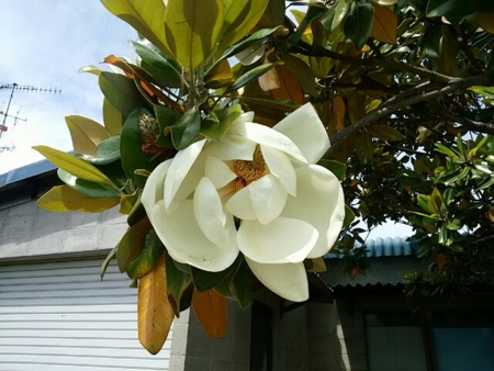 歯医者さんの帰り道のお宅の塀の外で咲いていたタイサンボク。
