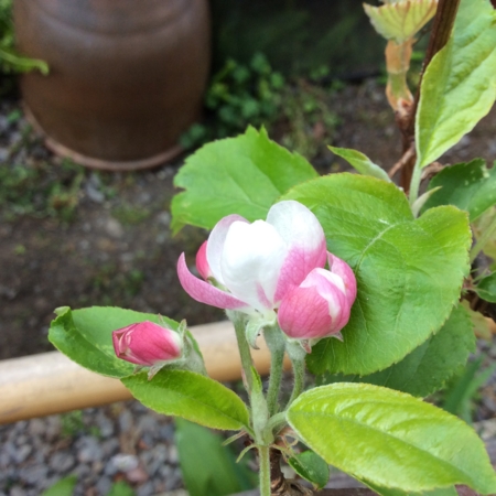 裏庭の鉢植えの藤が咲きそうなので玄関に持ってきた。